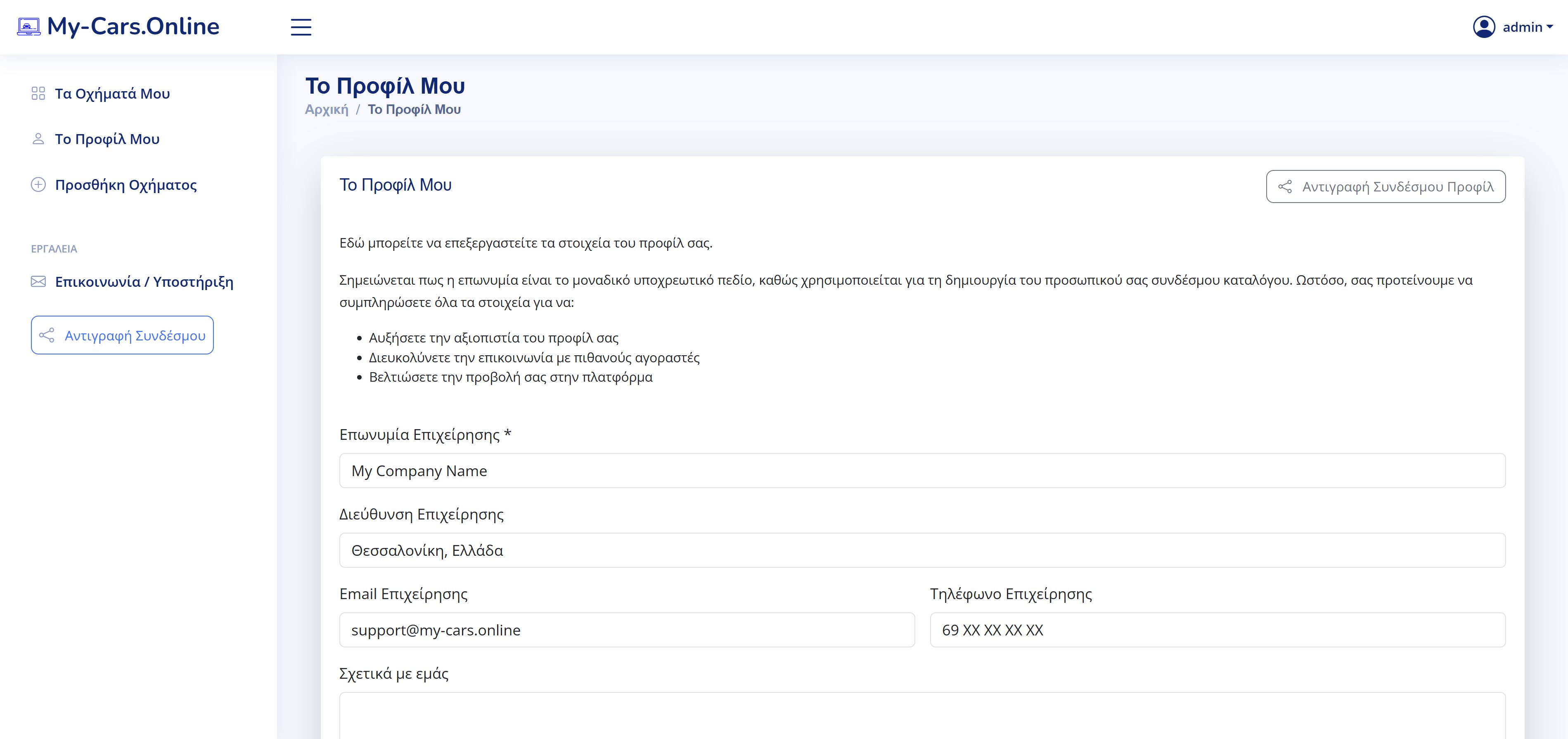 Φτιάξτε το προφίλ σας με τα βασικά στοιχεία της επιχείρησής σας. Η επαγγελματική εμφάνιση χτίζει εμπιστοσύνη προς στους αγοραστές, ενώ η διαχείριση του προφίλ σας και των αυτοκινήτων σας δεν απαιτεί τεχνικές γνώσεις ή περίπλοκα εργαλεία. Απλά και γρήγορα, χωρίς περίπλοκες διαδικασίες.